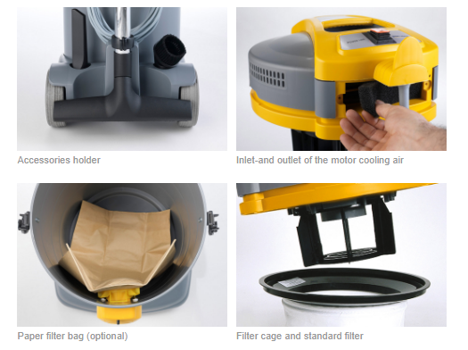 Usisavači sa snažnim i visoko učinkovitim motorima nove generacije. Verzija I opremljena je posudom od nehrđajućeg čelika. Utičnica četkice, Hepa filter uložak u opciji, držač pribora i filtri ispušnog zraka čine ih vrlo korisnim i univerzalnim za mnoge različite primjene.