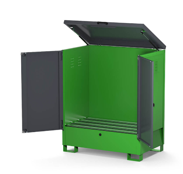 Ormar sa spremnikom ispod koji jamči idealan sustav za sprječavanje slučajnog izlijevanja u okolni okoliš. Opremljen vratima koja se mogu zaključati, omogućuje sigurno upravljanje bačvama ili limenkama koje sadrže ulja, ugljikovodike ili druge klasificirane tvari. Spremnik ispod ima kapacitet od 200 litara. Da bi se izračunao točan kapacitet kade, mora se uzeti u obzir da kadica mora moći sadržavati barem veću količinu između volumena najvećeg spremnika i 33% zbroja spremnika koji se drže u ormaru. Zahvaljujući ormaru moguće je skladištiti bačve vani bez nakupljanja kiše u spremniku za zadržavanje. Prisutnost nosača u bazi osigurava jednostavno rukovanje paletnim viličarom ili viličarom.