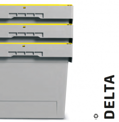 Kutije u seriji Delta imaju strukturu krnjeg stošca, što omogućuje stabilno i sigurno slaganje pri punom opterećenju. Kada su prazne, mogu se umetnuti jedna u drugu, što rezultira smanjenjem volumena od 70%.