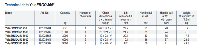Nosivost: 750 - 9000 kg. Redefinirajući dizalice s polugom, YaleERGO 360 ističe revolucionarnu ručicu koja omogućuje učinkovit rad u aplikacijama podizanja i vuče. Ergonomski dizajniran za veću sigurnost, YaleERGO 360 omogućuje operateru da radi do 12 puta brže i s čak 30% manjom vučnom silom nego s konvencionalnim alatima s čegrtaljkom.