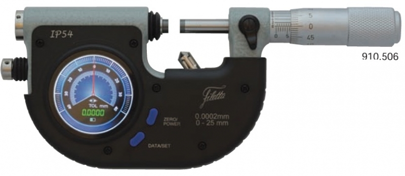 Mikrometri s digitalnim zaslonom u boji za digitalno i digitalno-analogno očitavanje. Zbog uvlačivog nakovnja, finog podešavanja i oznaka tolerancije, ovi mikrometri su vrlo prikladni za serijsku kontrolu i mjerenja tolerancija. Mjerna vrijednost je žute, zelene ili crvene boje, ovisno o tome je li mjerenje ispod, unutar ili iznad postavljenih granica tolerancije.