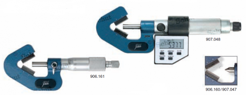 Analogni i digitalni mikrometri s čeljustima u obliku prizme za mjerenje promjera objekata s neparnim brojem žljebova kao slavina, glodala i - mlinova. Kut otvora prizme je napravljen za 3, 5 ili 7 komada utora.