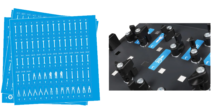 Praktične oznake alata, priložene uz proizvod, olakšavaju brzo i jednostavno prepoznavanje vrste alata za postavljanje u određeni dio Pikpad ladice za alate. Nakon što su razmaci podijeljeni, možete staviti posebnu naljepnicu na različita područja koja označava vrstu alata i odgovarajuću veličinu ili se mogu izraditi prilagođene naljepnice pomoću raspoloživog papira koji nije prethodno izrezan. Korištenje ovog sustava olakšava rad rukovatelja jer dobivaju cjelokupni pregled svoje ladice i lako mogu uočiti nedostajuće alate.