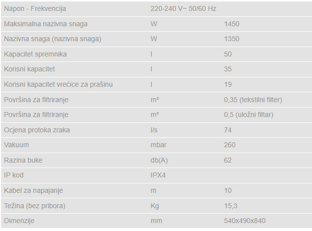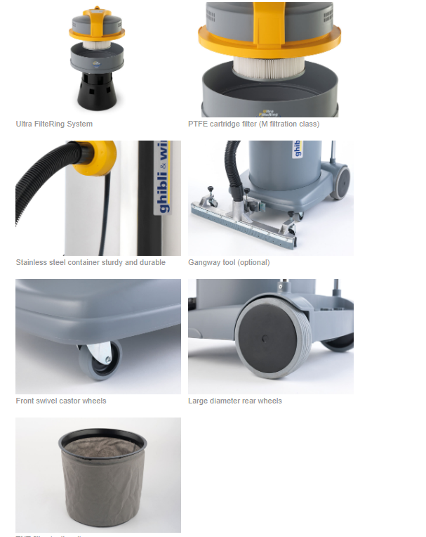 Mokro/suhi usisavač opremljen snažnim i visoko učinkovitim motorom nove generacije. Model isporučen sa sustavom Ultra FilteRing (UFS) koji, zahvaljujući posebnom polipropilenskom odstojnom prstenu, omogućuje da uložni filtar (klasa filtracije M) bude uvijek instaliran, jamčeći najbolje usisne performanse i maksimalnu zaštitu motora (čak i u slučaju nepravilne uporabe od strane operater). UFS je također praktično rješenje: plutajući sustav je neovisan o glavi motora i fiksiran izravno na prsten, čineći čišćenje i održavanje brzim, jednostavnim i intuitivnim. Power WD 50 I opremljen je spremnikom od nehrđajućeg čelika. Filtar ispušnog zraka. Veliki protok zraka i usisna snaga. Okvir za vožnju od plastičnog materijala otpornog na udarce s držačima pribora. Papirnata filtarska vrećica, najlonski filtar, HEPA uložak filtar i TNT filtar opcijski.