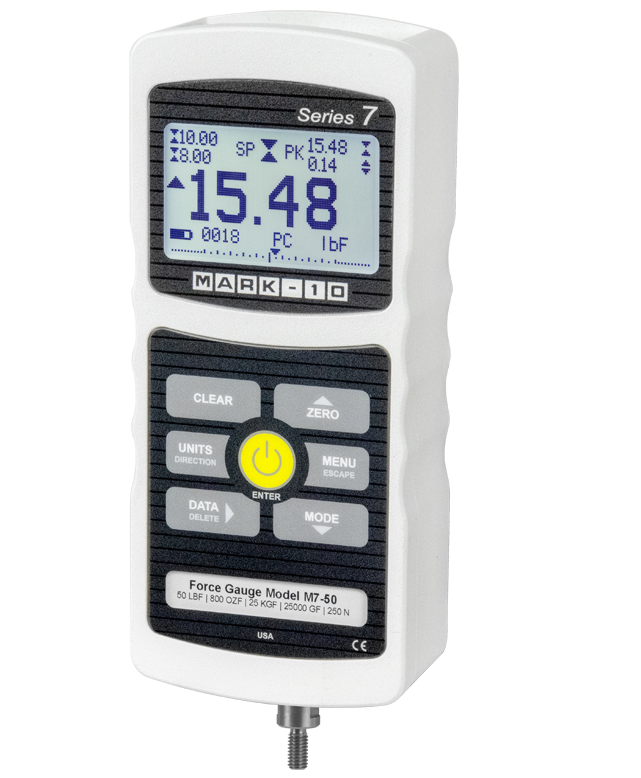 Serija 7 uključuje mjernu jedinicu koeficijenta trenja i mjernu jedinicu koju definira korisnik. Za povećanje produktivnosti, mjerači također imaju funkcije automatskog izlaza podataka, pohrane podataka i nuliranja nakon završetka otkrivanja prekida, usrednjavanja, vanjskog okidača i otkrivanja 1./2. vrha. Mjerači sile serije 7 izravno su kompatibilni s ispitnim postoljima Mark-10, uključujući ESM303, kako bi omogućili funkcije kao što su ispitivanje loma, ispitivanje rastezanja, ispitivanje kompresije, dinamičko držanje opterećenja, mogućnost upravljanja računalom i mnoge druge primjene. Mjerni uređaji uključuju MESUR® Lite softver za prikupljanje podataka. MESUR® Lite prikazuje kontinuirane ili pojedinačne podatke u tablici. Izvoz u Excel jednim klikom omogućuje daljnju manipulaciju podacima.