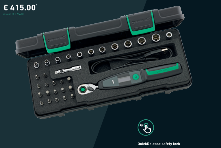 S integriranom čegrtaljkom s finim zubima s 80 zuba i tehnologijom QuickRelease (Sprječava nenamjerno odvajanje nastavaka ili alata za umetanje i omogućuje brzu promjenu alata, od produžne šipke do ključa koji se koristi).