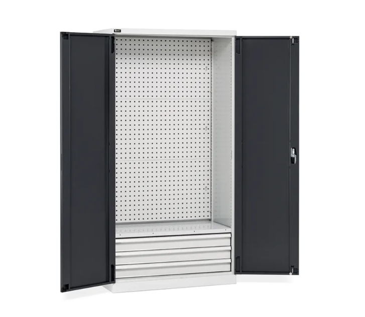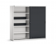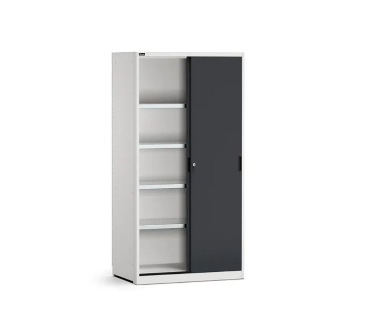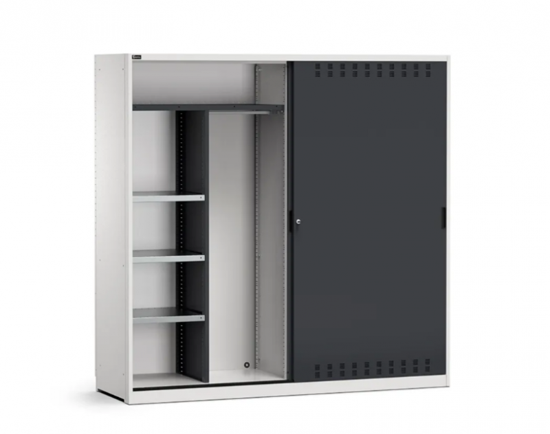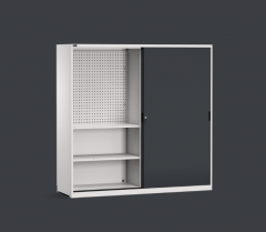 Radionički ormarić za alat izrađen je od čvrstog čeličnog lima i dostupan je s krilnim ili kliznim vratima. S različitim dostupnim širinama, garažni namještaj može se opremiti prostranom konstrukcijom prikladnom za pohranu alata i rezervnih dijelova.