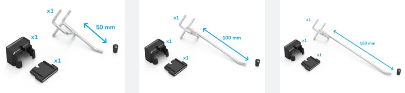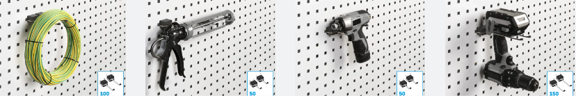 Kuke za perforirane ploče dostupne su u 3 dubine: 50, 100 ili 150 mm. Različite veličine čine ih idealnima za organiziranje i pohranjivanje alata kao što su čekići, bušilice i ključevi, kao i za izlaganje proizvoda u trgovinama i prodavaonicama željezarije.