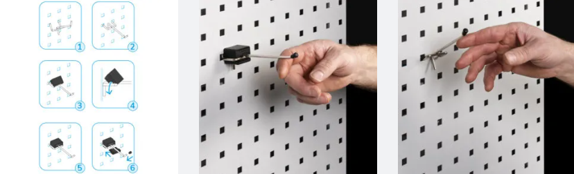 Block metalne kuke se brzo, jednostavno i sigurno postavljaju. Nakon što je stražnji dio kuke umetnut u četvrtaste rupe na ploči alata, pričvršćena je patentirana sigurnosna brava koja blokira nosač alata u vodoravnom položaju i sprječava njegovo prevrtanje kada se alat uklanja ili sprema.