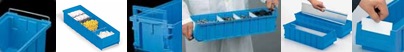 Plastične kutije sa stranicama otpronim na udarce, dostupne u 10 različitih dimenzija, razne mogućnosti particioniranja (uzdužno i poprečno). Mjesto za natpisnu pločicu, moguć smještaj u police prilagođene ovoj seriji. Mogućnost naručivanja drški za nošenje.