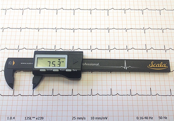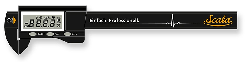 Mjerilo pomično digitalno kardiološko tvrtke Scala Messzeuge omogućuje vam brzu i pouzdanu procjenu ispisa EKG-a s brzinama uvlačenja od 25 mm/s ili 50 mm/s u samo nekoliko koraka. Kardiološki relevantni podaci kao što su broj otkucaja srca (HR, bpm), trajanje QT intervala (QT), QT vrijeme korigirano frekvencijom (QTc), Sokolow-Lyonov indeks (SL), smanjenje ST, QRS kompleks, milisekunde (ms) i milivolti (mV) mogu se procijeniti pritiskom na gumb i omogućuju vam brzu dijagnozu. To značajno pojednostavljuje ručnu procjenu EKG-a jer se broj mjerenja smanjuje integriranim koracima izračuna. To također povećava točnost procjene, jer se zbroj mjernih netočnosti smanjuje s brojem mjerenja. Također štedi vrijeme tijekom ocjenjivanja, jer nema potrebe za dodatnim traženjem podataka u bilježnicima. Konkretno, automatski izračun frekvencijski korigiranog QT vremena (= QTc) ovdje je od medicinske važnosti, jer omogućuje brzo i pouzdano otkrivanje takozvanih sindroma dugog QT pomoću Scala kardio čeljusti.
