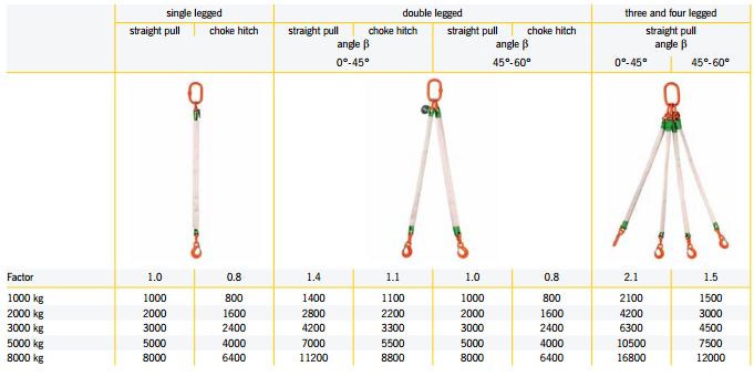 Nosivost priveznica u ovisnosti o kombinaciji i kutu podizanja.