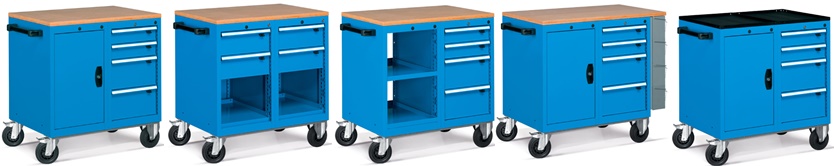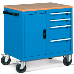 Radna jedinica izrađena od čelika sa radnom pločom od multiplex drveta nosivosti 250 kg. Kotači su u kombinaciji 2 fiksirana + 2 rotirajuća gumena kotača promjera 150 mm. Ladice su u potpunosti izvlačive. Sve ladice imaju zajedničko zaključavanje.