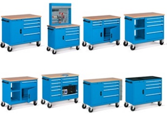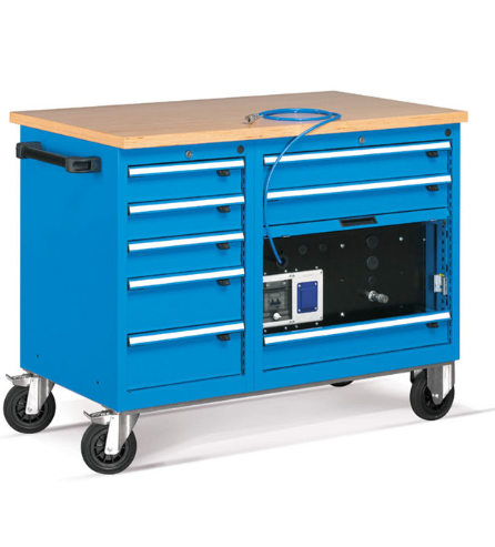 Radna jedinica izrađena od čelika sa radnom pločom od multiplex drveta nosivosti 250 kg. Kotači su u kombinaciji 2 fiksirana + 2 rotirajuća gumena kotača promjera 150 mm. Ladice su u potpunosti izvlačive. Sve ladice i ormarići imaju zajedničko zaključavanje.