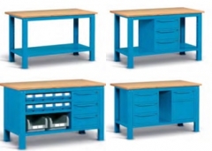 Radni stol izrađen od čelika sa radnom pločom od Multiplex drva, dimenzija 1500 x 750 x 880 mm. Boja stola je plava (RAL 5012). Nosivost je 1000 kg.
