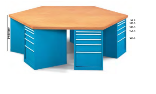 Šesterokutni radni stol sa radnom pločom od Multiplex drva i 6 ormarića (svaki na jednoj strani) sa po 5 ladica.
