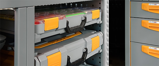 Fiksna polica za smještaj odvojivih plastičnih kutija za alat ili sitni pribor serije Store Box, ovisno o širini modula moguć smještaj jedne, dvije ili tri kutije različitih visina.
