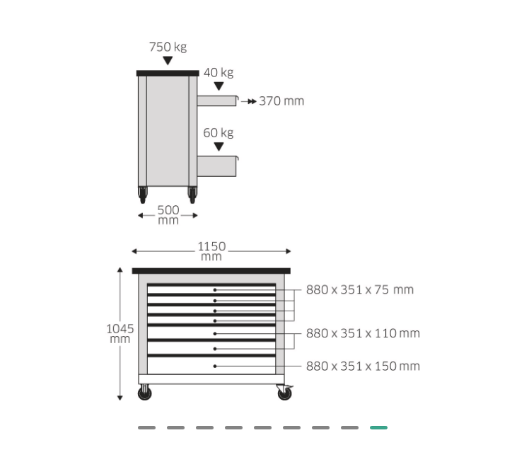 - dimenzije ladica 880 x 350 mm, unutarnje visine ladica: 4 x 72 mm, 2 x 110 mm i 1 x 150 mm