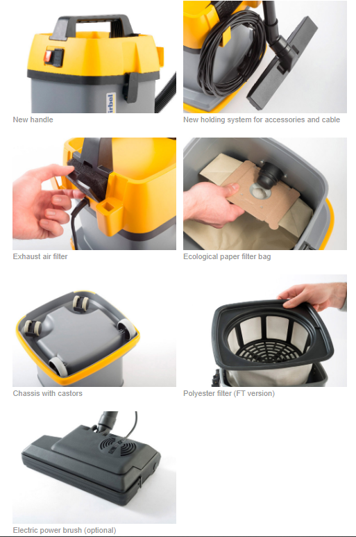 Najnovija verzija kompaktnog, snažnog, ekonomičnog i praktičnog modela koji je bio referentna točka u profesionalnom usisavanju malih dimenzija. Nova ručka, kabel i sustav držanja pribora koji jamče maksimalnu jednostavnost korištenja. Lako se uklanja i čisti filtar ispušnog zraka. Dostupne su dvije verzije: FT opremljena tekstilnim filtrom (od poliestera) ili FC opremljena standardnim patronskim filtrom. Mogućnost spajanja na električnu četku. Opremljen standardnim branikom protiv udarca.